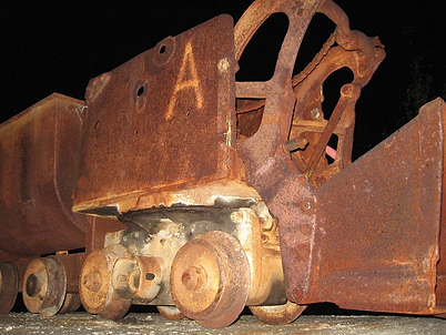 The whole atmosphere of Cobalt is a little eerie; there is a Gothic tension that pervades the old mine workings. I suppose the ever-present past can be a little unsettling. You are constantly reminded of a hidden landscape that exists in the darkness beneath your feet. There are vast drops and tunnels last trodden, in some places over 100 years ago. In the twilight you stand amid obsolete machinery, dredged up from below and scattered along the edges of mirror smooth lakes. I watched the shadows stretch across the bluish-black water. My attention is drawn to a dismal looking elevator cage. It is a box no bigger than a phone booth. several miners would squeeze into each such cannister for a harrowing drop down into the depths. Some of the area's tunnels probed silver veins 1600 feet beneath the surface. Rails in the bottom of the cage allowed the insane inclusion of a shifting ore skip. About half of the accidents that occurred in 1906 were related to falls from these enclosures.